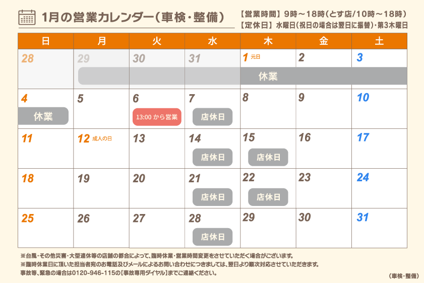 ※HPに記載している割引・特典は、お電話や予約フォームからご予約を頂いたお客様にのみ適用させて頂きます。【年末年始のお問い合わせについて】2025年12月29日〜2026年1月4日の期間について、以下の通りご案内いたします。・お電話でのお問い合わせ:この期間はつながりません。・メールでのお問い合わせ:期間中にいただいたメールは、2026年1月5日以降に順次お返事いたします。お返事にお時間がかかる場合がありますので、お急ぎの方は1月5日以降にお電話にてお問い合わせくださいませ。・車検、整備:この期間は行なっておりません。